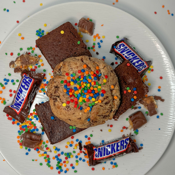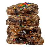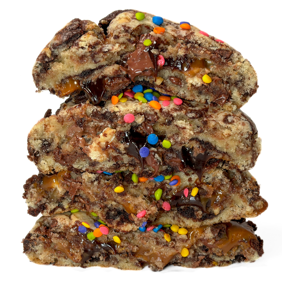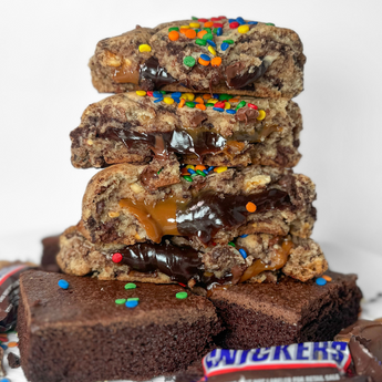 Chopped snickers batter with fudge brownie & chocolate chips, filled with ganache & caramel, topped with bright colored sprinkles