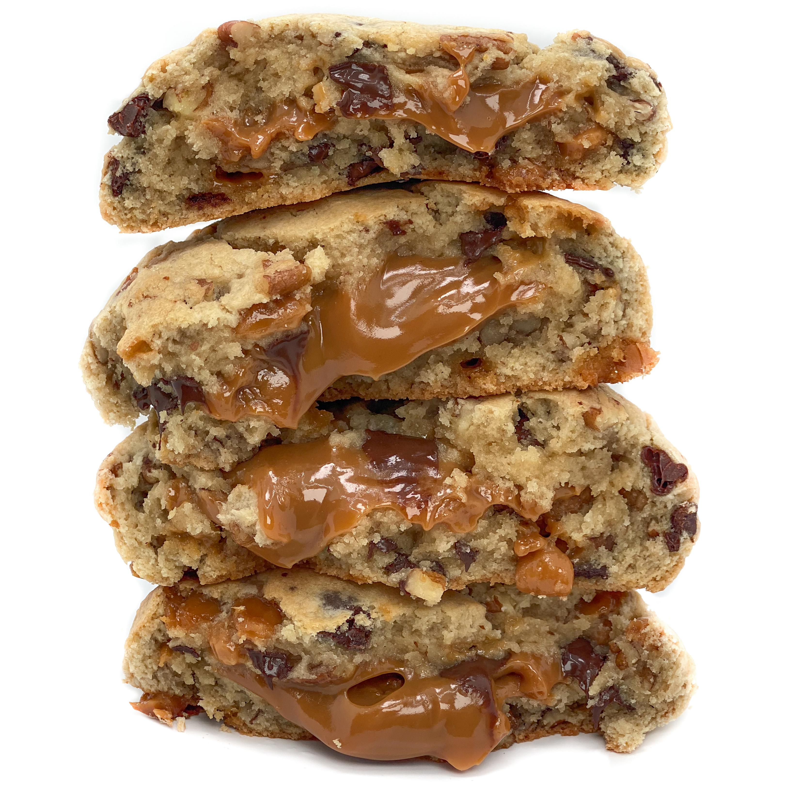 Bourbon Flavored Batter with Pecans, Caramel Bits & Chocolate Chips, filled with Caramel