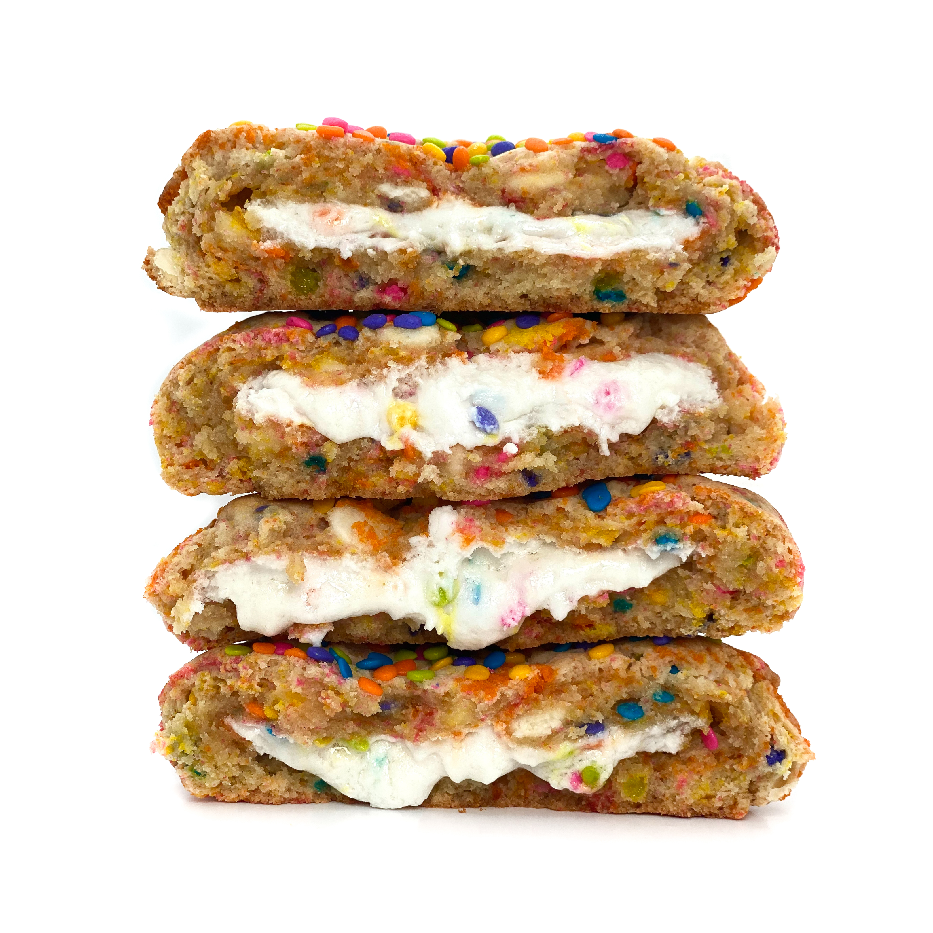 Birthday cake batter with neon sprinkles & white chips, filled with a neon sprinkled creme, topped with neon sprinkles