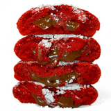 Pancake batter with diced cinnamon apples, filled with caramel, dusted with powdered sugar