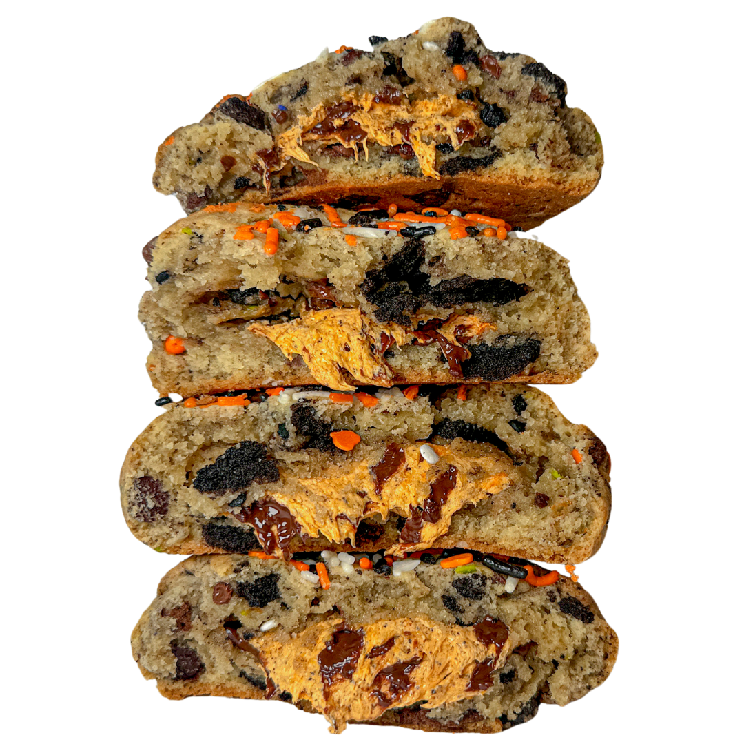 Chocolate chip teddy graham batter with Oreos, chocolate chips & Halloween sprinkles, filled with an orange Oreo crumb creme with mini chocolate chips, topped with Halloween sprinkles