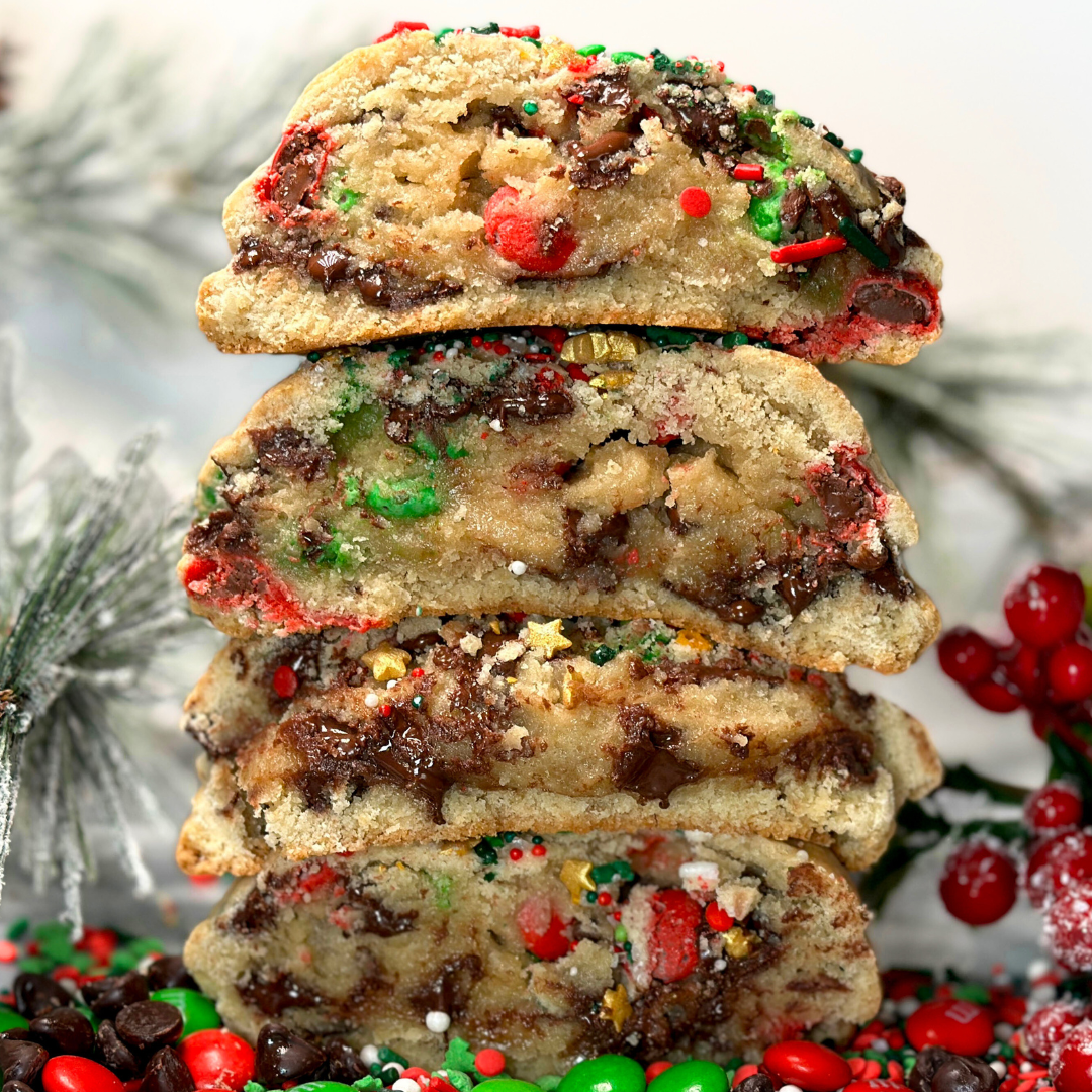 Red & green M&M batter, topped with holiday sprinkles