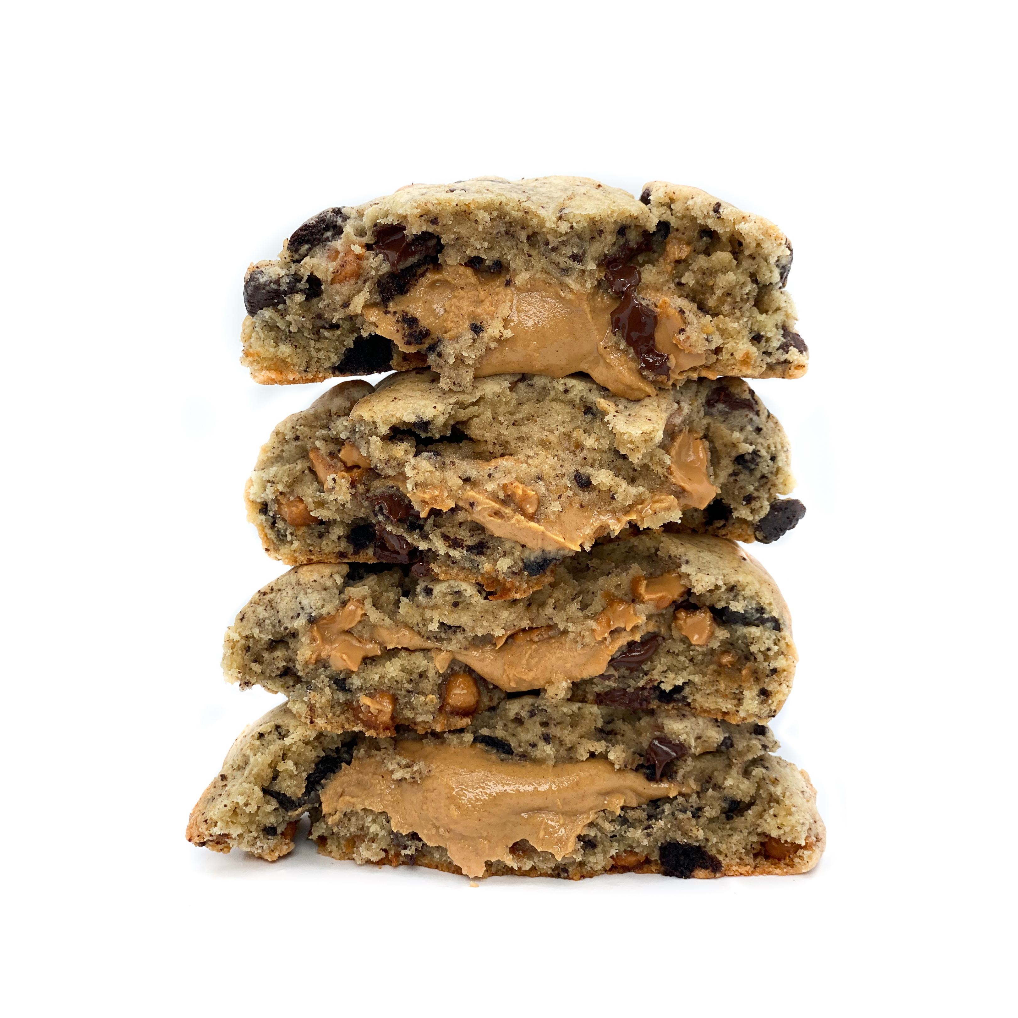Peanut butter Oreo batter with peanut butter chips & chocolate chips, filled with creamy peanut butter