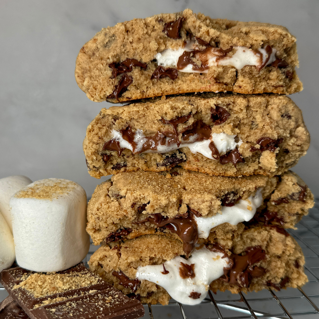 Protein based graham cracker batter with chocolate chips, stuffed with a marshmallow, topped with graham cracker crumbs