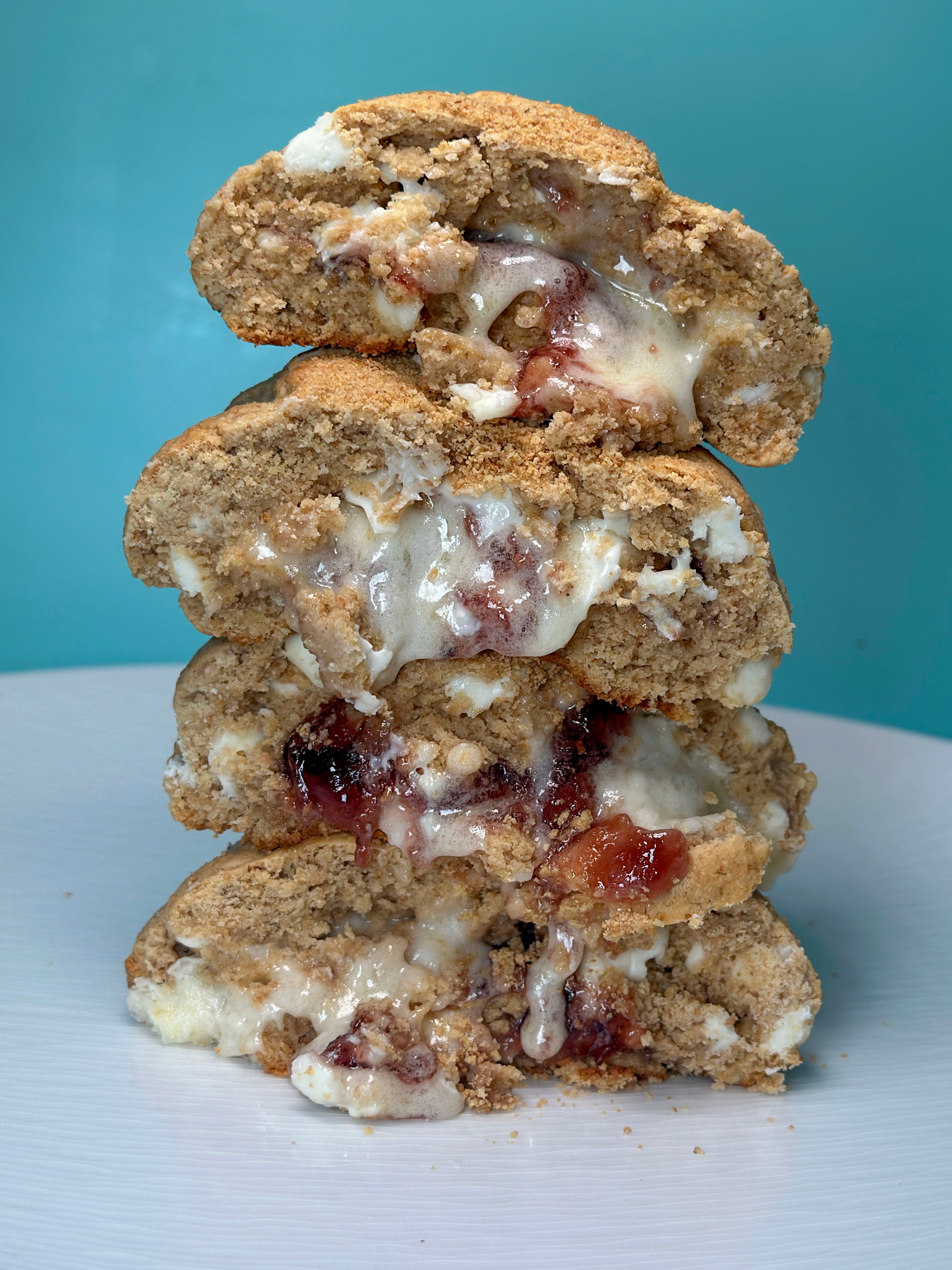 Graham cracker crumbs & white chocolate chips, filled with raspberry jam & cream cheese frosting, topped with graham cracker crumbs