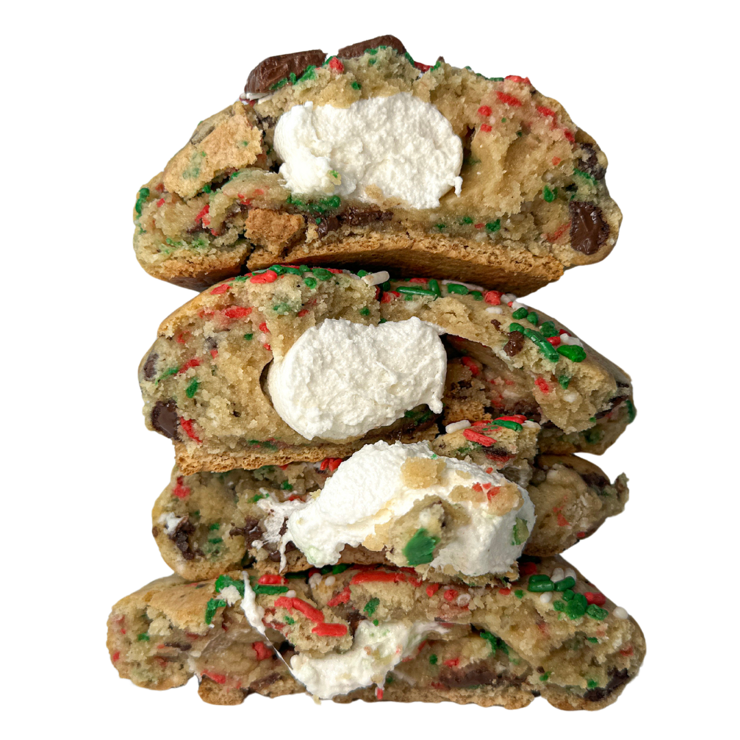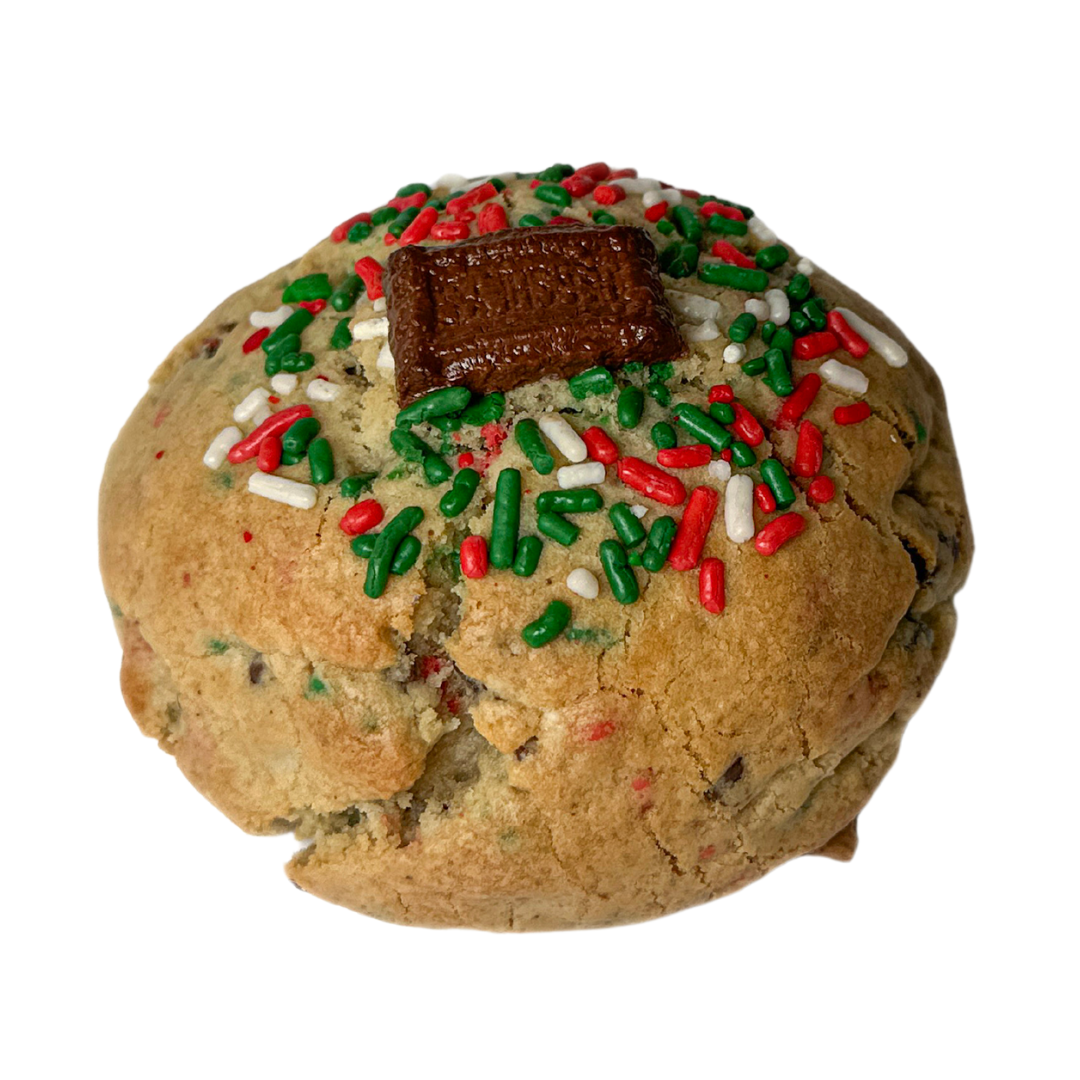 Graham cracker bottom, chocolate chips, red, green and white sprinkles filled with a full oreo and marshmallow topped with holidays sprinkles & Hershey bars